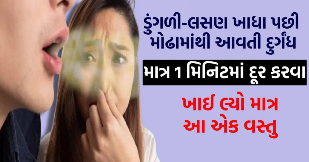 ડુંગળી અથવા લસણ ખાધા પછી મોંઢામાંથી આવતી ગંધને દૂર કરવા માટે ફુદીનો ફાયદાકારક છે. સુંગધી પાનવાળી એક વિલાયતી વનસ્પતિ ના તાજા પાંદડા ખાવાથી મોઢાની દુર્ગંધ દૂર થાય છે. અને મોં સાફ થાય છે. ભોજન કર્યા પછી લીંબુ પાણી પીશો તો મોંમાંથી આવતી દુર્ગંધ પણ દૂર થઈ શકે છે. લીંબુમાં જોવા મળતા સાઇટ્રિક એસિડ અને એન્ટીબેક્ટેરિયલ તત્વો ડુંગળી અને લસણની ગંધને દૂર કરીને શ્વાસને સંપૂર્ણ રીતે તાજું કરવામાં મદદ કરે છે. થોડું હૂંફાળું પાણી લો અને તેમાં લીંબુનો રસ મિક્સ કરો. જો તમે ડુંગળી-લસણની દુર્ગંધથી તરત જ છુટકારો મેળવવા માંગતા હોવ તો થોડા પાણીમાં લીંબુનો રસ ભેળવીને કોગળા કરો.