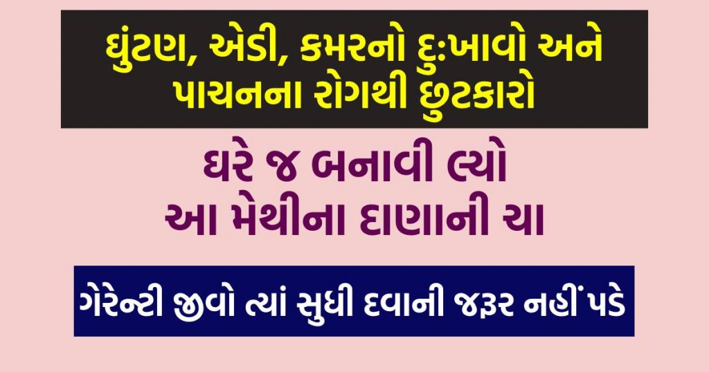 હવે અમે તમને જણાવીશું આ મેથીની ચા થી થતાં અનેક ફાયદાઓ. આ ચા પીવાથી ઘુંટણનો દુ:ખાવો, એડીનો દુ:ખાવો, કમરનો દુ:ખાવો વધારેમાં વધારે ત્રણ મહિનામાં મટી જશે. સોજા ઉતરી જશે. ઘુંટણની બળતરા બંધ થશે. સાયટીકા અને કમરનો દુઃખાવો મટી જશે. ફુલેલું પેટ અને વજન પણ ઓછું થશે.